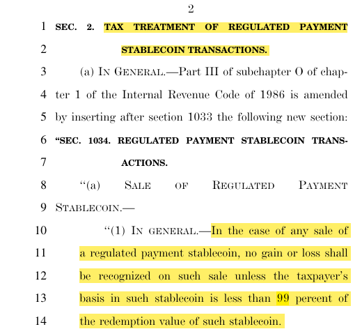 To qualify for this treatment, the stablecoin must be regulated under the GENIUS Act and maintain its value within 1% of $1.00. This ties the tax framework directly to the stablecoin regulatory structure already moving through Congress, creating a linked legislative approach where compliance under one law unlocks benefits under the other.
